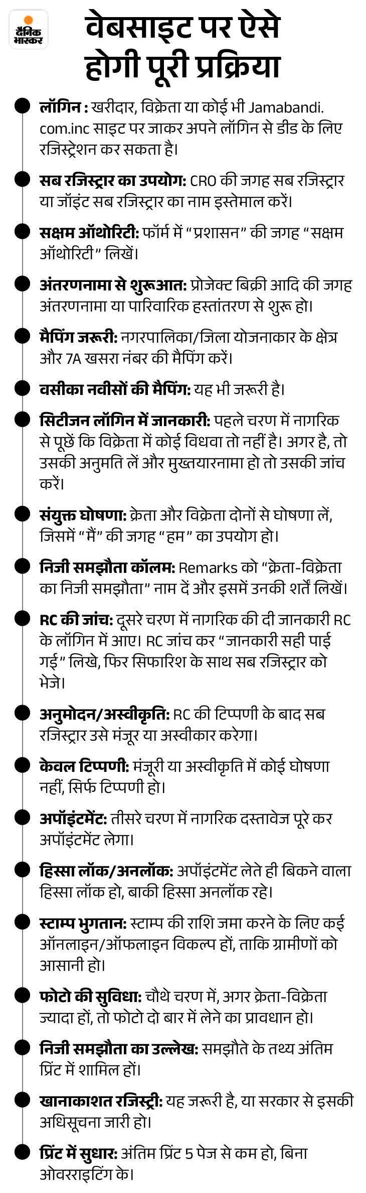• नई प्रक्रिया में खुद करो डीड : नई प्रक्रिया काफी आसान और सरल है। इसमें खरीदार, विक्रेता या कोई भी Jamabandi.com.inc साइट पर जाकर अपने लॉगिन से डीड के लिए रजिस्ट्रेशन कर सकता है। इस टेम्प्लेट में खरीदार और विक्रेता को डीड और अपनी जानकारी भरनी है। साथ ही ऑनरशिप के डॉक्यूमेंट अपलोड करके अपनी मर्जी के मुताबिक किसी भी दिन की अपॉइंटमेंट लेनी है।