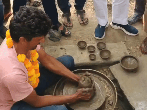 भादसोड़ा में सांसद सीपी जोशी एक कुम्हार के घर पहुंचे। वहां कुम्हार शांतिलाल मिट्टी के दीए बना रहा था। शांतिलाल को काम करते देख सांसद जोशी ने भी खुद दीए बनाने की इच्छा जताई। उन्होंने चाक पर कुछ दीए बनाए और मिट्टी के चाक को चलाने की तकनीक भी सीखी। ग्रामीणों ने यह नज़ारा देखा तो वे भी मौके पर पहुंच गए और सांसद के साथ तस्वीरें खिंचवाईं।