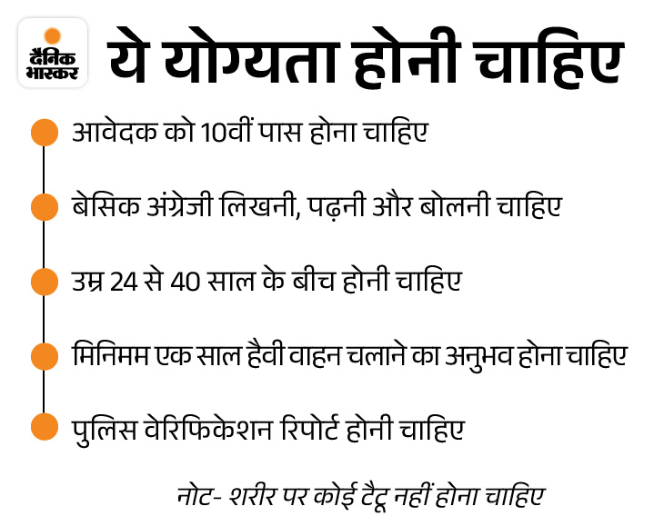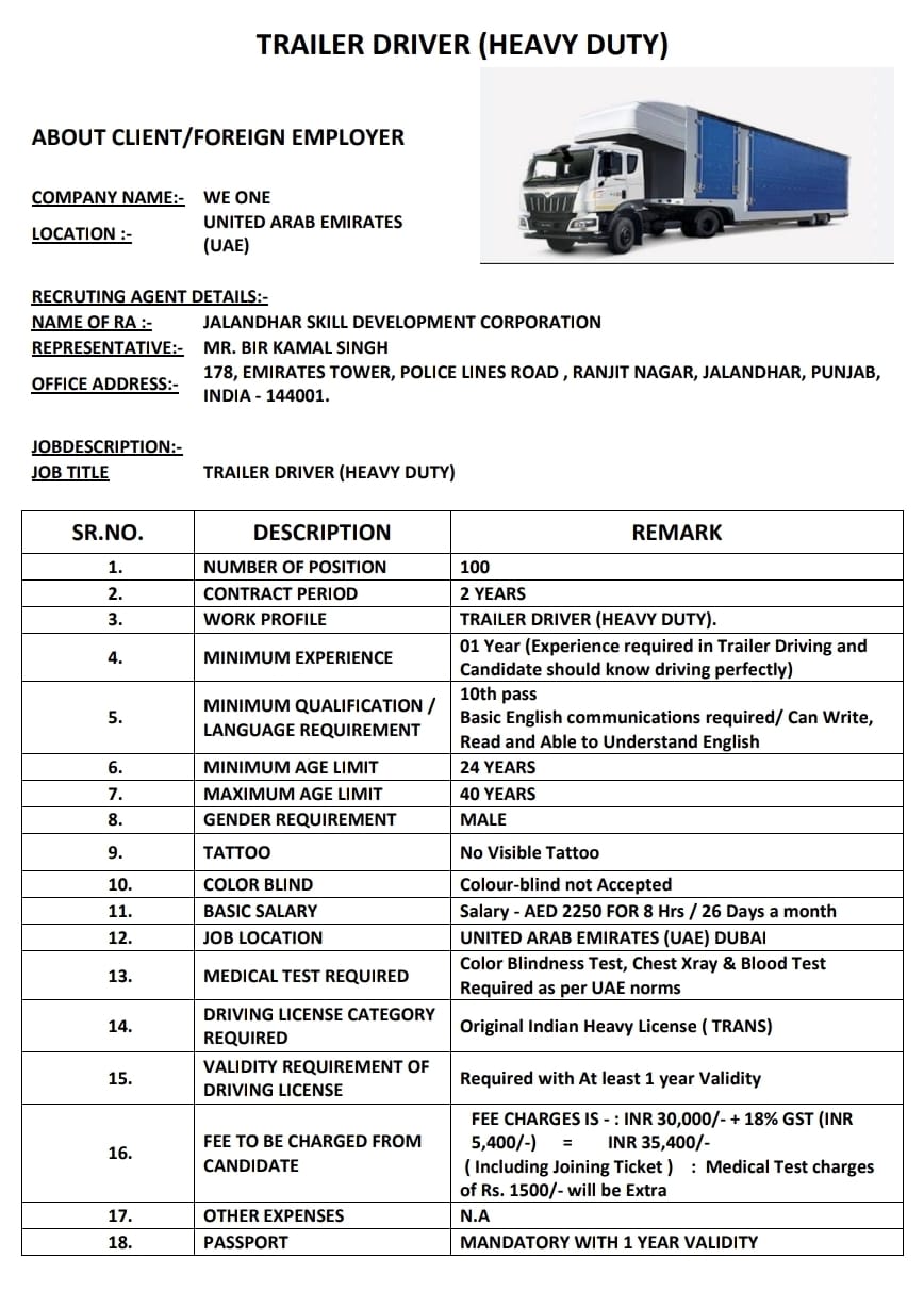 100 हैवी ड्राइवर रखे जाएंगे भर्ती विज्ञापन के अनुसार, UAE में 100 हैवी ड्राइवर भर्ती किए जाएंगे। कल तक इसके लिए आवेदन कर सकते हैं। 29 अक्टूबर वर्ल्ड स्किल आर्गेनाइजेशन में इसका इंटरव्यू होगा।