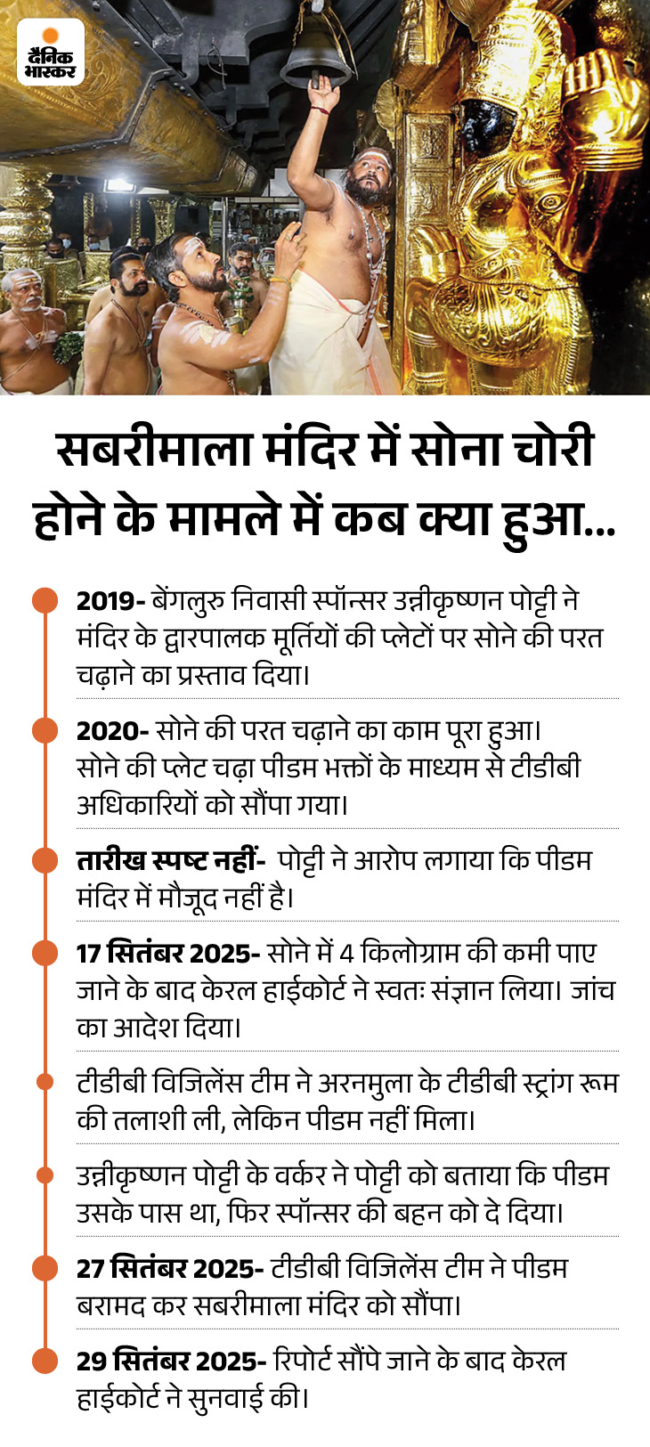 इस मामले में त्रावणकोर देवास्वोम बोर्ड (TDB) की विजिलेंस टीम ने शुरुआती जांच के बाद रिपोर्ट पेश की थी, जिसमें बोर्ड के 9 अधिकारियों के खिलाफ ऐक्शन लेने का फैसला किया था। इसके बाद मामला हाईकोर्ट पहुंचा था जहां कोर्ट ने 6 अक्टूबर को जांच के लिए SIT गठित की थी, जिसे 6 हफ्ते में रिपोर्ट देना है।