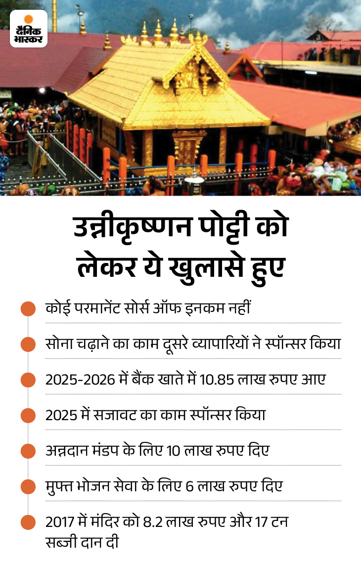 इस मामले में उन्नीकृष्णन पोट्टी भी आरोपी हैं। TDB की रिपोर्ट के मुताबिक, उन्निकृष्णन ने द्वारपालक मूर्तियों पर सोने की परत चढ़ाने की पेशकश की थी, उन्हें इसके लिए काफी मात्रा में सोना सौंपा गया था।