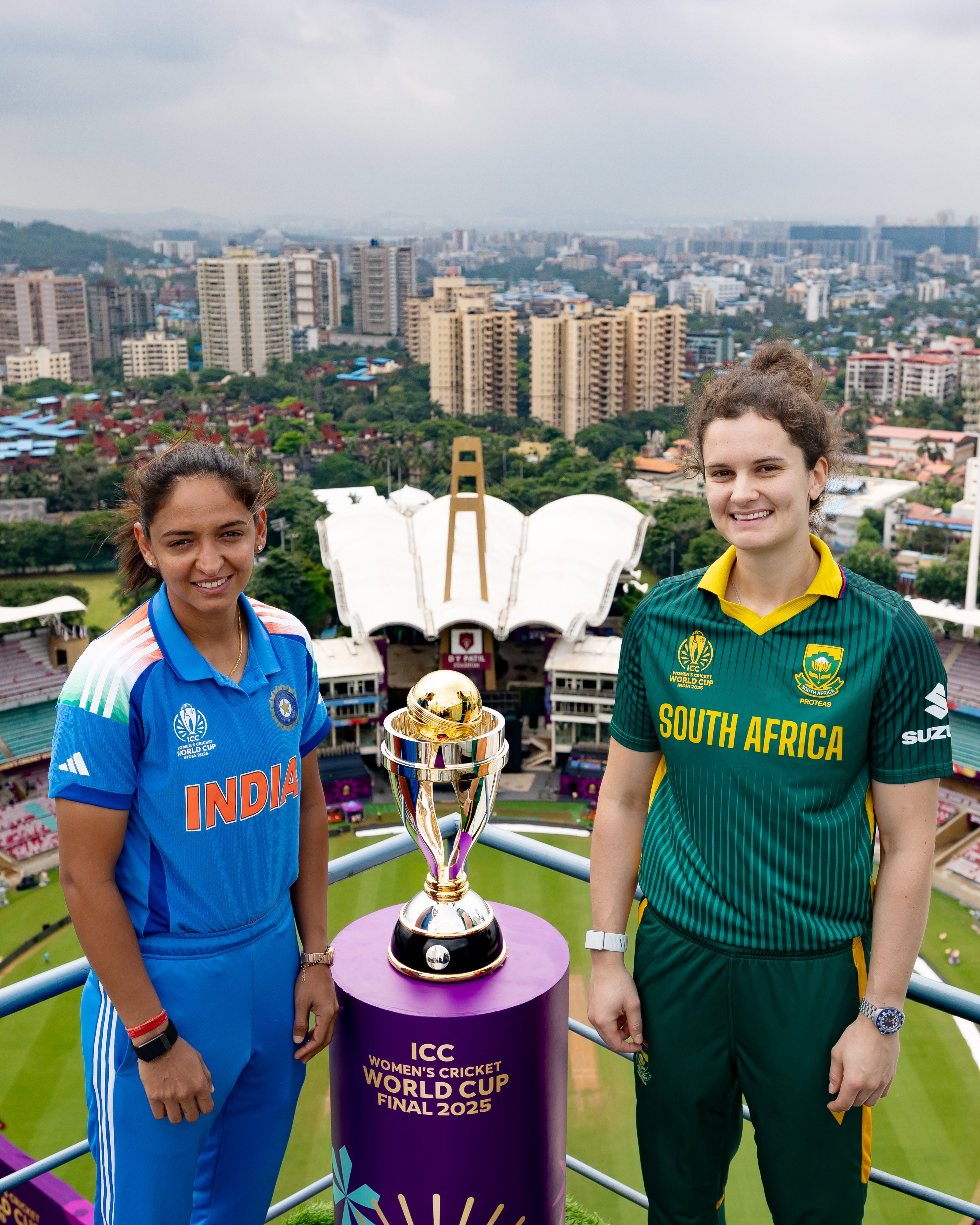 शनिवार को भारतीय कप्तान हरमनप्रीत कौर और साउथ अफ्रीका की कप्तान लौरा वोल्वार्ट का ट्रॉफी के साथ फोटो शूट हुआ। ICC ने फोटो सोशल मीडिया पर शेयर की।