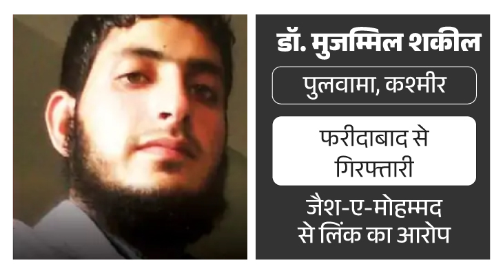 सुरक्षा एजेंसियों के मुताबिक, पुलवामा के कोइल गांव का रहने वाला डॉ. मुजम्मिल शकील जैश-ए-मोहम्मद नेटवर्क का हिस्सा है। आदिल से सुराग मिलने पर पुलिस ने उसे फरीदाबाद में ट्रेस किया। इसके बाद फरीदाबाद और जम्मू-कश्मीर पुलिस ने उसे अरेस्ट कर लिया।