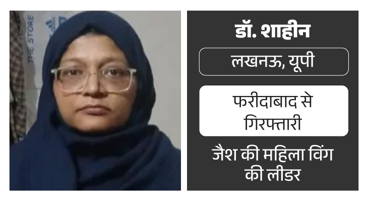 लखनऊ से ताल्लुक रखने वाली डॉ. शाहीन भारत में जैश-ए-मोहम्मद की महिला विंग को लीड कर रही थी। उसने प्रयागराज के मेडिकल कॉलेज से पढ़ाई की है। शाहीन को आतंकी मसूद अजहर की बहन सादिया अजहर ने भारत में महिला विंग जमात-उल-मोमिनात की जिम्मेदारी दी थी। ये लड़कियों का ब्रेनवॉश कर उन्हें टास्क देती थी। उसके संपर्क में कौन-कौन था, इसकी जानकारी जुटाई जा रही है।