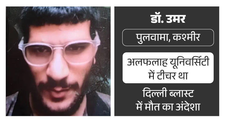 फरीदाबाद की अलफलाह यूनिवर्सिटी में पढ़ाने वाला डॉ. उमर कश्मीर के पुलवामा का रहने वाला है। दिल्ली में ब्लास्ट वाली कार उमर ही चला रहा था। उसके मारे जाने की खबर है। DNA जांच से ही उसकी मौत की पुष्टि हो सकेगी। हालांकि, सुरक्षा एजेंसियां अब तक इसे आत्मघाती हमला नहीं मान रही हैं।