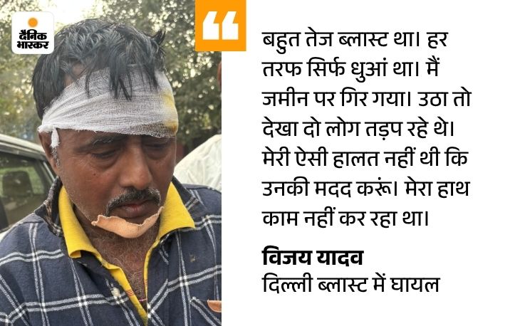 ब्लास्ट में घायल हुए, लेकिन लिस्ट में नाम नहीं LNJP हॉस्पिटल के बाहर हमें विजय यादव मिले। बिहार के सहरसा जिले के रहने वाले हैं। लाल किले के पास पानी बेचते हैं। ब्लास्ट हुआ, तब वे उसी जगह मौजूद थे। ब्लास्ट से घायल हो गए, लेकिन उनका नाम घायलों की लिस्ट में नहीं है। विजय के सिर, बाएं हाथ और चेहरे पर पट्टी लगी है।