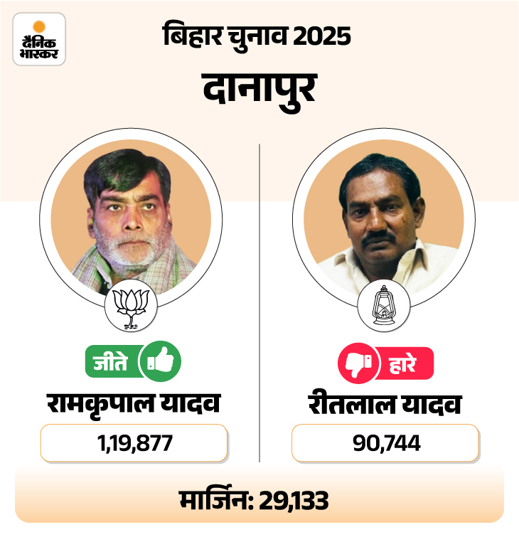 दानापुर में BJP के रामकृपाल यादव 29,133 वोट से जीत गए हैं। दूसरे नंबर पर RJD के बाहुबली रीतलाल यादव रहे।