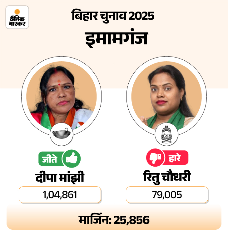 जीत की वजह 1. इमामगंज मांझी परिवार का गढ़ है। जीतन राम मांझी 2015 के बाद यहां से लगातार तीन बार जीते। 2024 के उपचुनाव में दीपा मांझी जीतीं। 2. दलित HAM का कोर वोट बैंक हैं, NDA का सवर्ण वोट साथ आने का फायदा मिला। 3. विधायक बनने के बाद दीपा मांझी इमामगंज में एक्टिव रहीं। वे लोगों के बीच जाती रहती हैं।