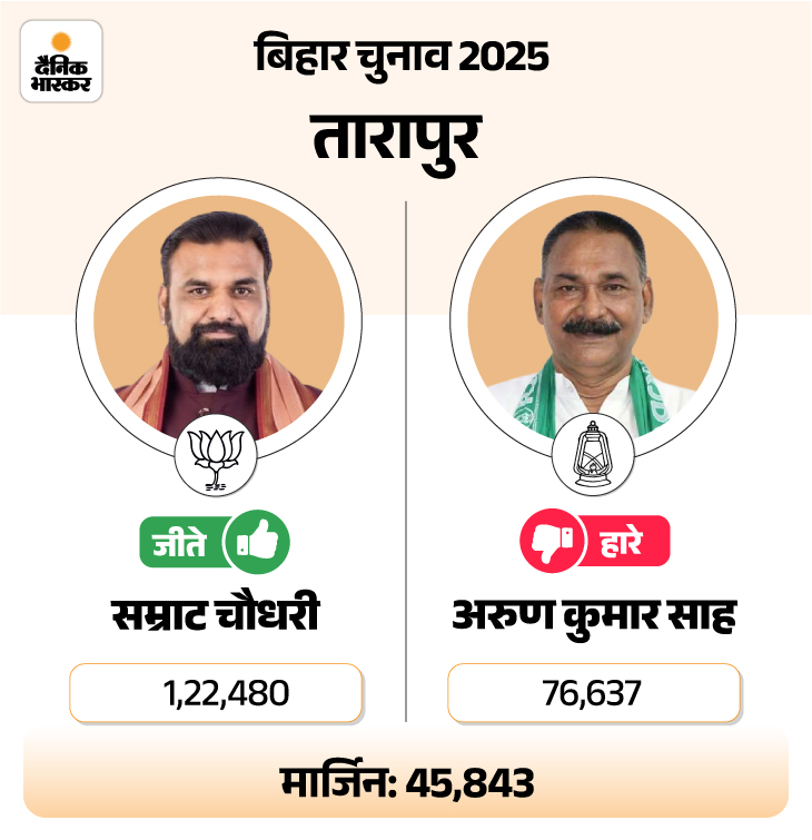 तारापुर से BJP के सम्राट चौधरी 45,843 वोट से जीत गए हैं। RJD के अरुण कुमार साह दूसरे नंबर पर रहे।