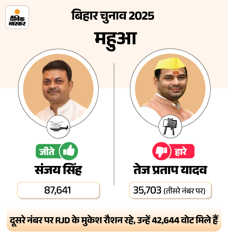 RJD से अलग होकर पहला चुनाव लड़ रहे तेजप्रताप यादव महुआ से हार गए हैं। उन्हें 35,703 वोट मिले। LJP (R) के संजय कुमार सिंह को 87,641 वोट मिले। उन्होंनें RJD के मुकेश कुमार रौशन 44,997 वोट से हराया।