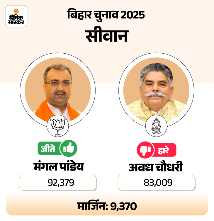 सीवान में BJP के मंगल पांडे 9,370 वोट से जीते हैं। उन्हें 92,379 वोट मिले। दूसरे नंबर पर रहे RJD के अवध बिहारी चौधरी को 83,009 वोट मिले।