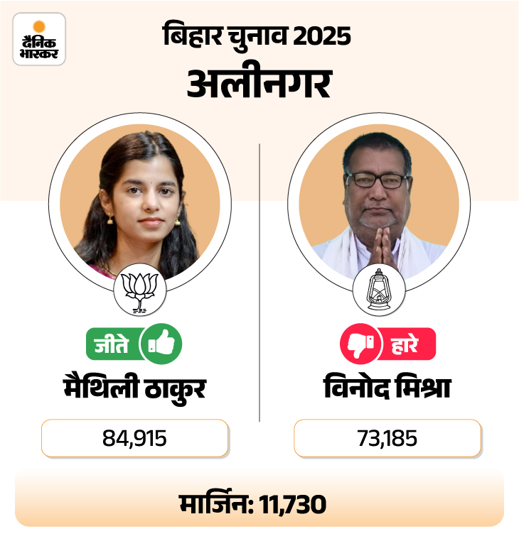 अलीनगर में BJP की मैथिली ठाकुर 11,730 वोट से जीत गई हैं। उन्हें 84,915 मिले। RJD के विनोद मिश्रा दूसरे नंबर पर रहे।
