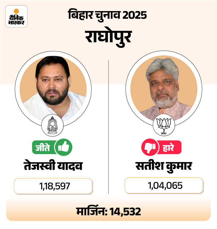 राघोपुर में तेजस्वी यादव 14,532 वोट से जीत गए हैं। दूसरे नंबर पर BJP के सतीश कुमार रहे। शुरुआत में तेजस्वी करीब 3500 वोट से पिछड़ रहे थे। 2020 में तेजस्वी 38,174 वोट से जीते थे।