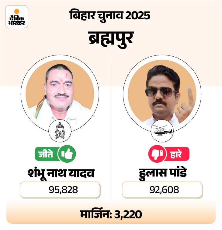 ब्रह्मपुर में RJD के शंभू नाथ यादव जीत गए हैं। उन्हें 95,828 वोट मिले। शंभू नाथ यादव ने LJP(R) के बाहुबली हुलास पांडे को हराया।