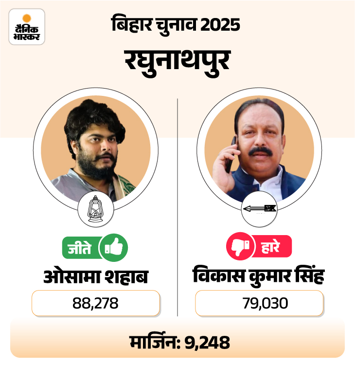 रघुनाथपुर में सीवान के पूर्व सांसद शहाबुद्दीन के बेटे ओसामा शहाब 9,248 जीत गए हैं। दूसरे नंबर पर JDU के विकास कुमार सिंह रहे।