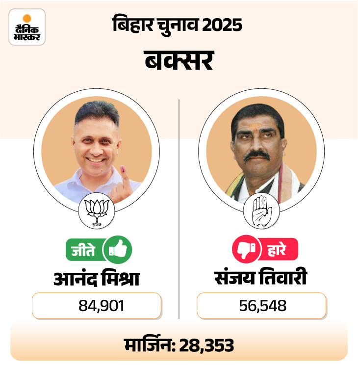 बक्सर में BJP कैंडिडेट और पूर्व IPS अधिकारी आनंद मिश्रा जीत गए हैं। दूसरे नंबर पर कांग्रेस के संजय तिवारी रहे। आनंद मिश्रा को 84,901 वोट मिले।