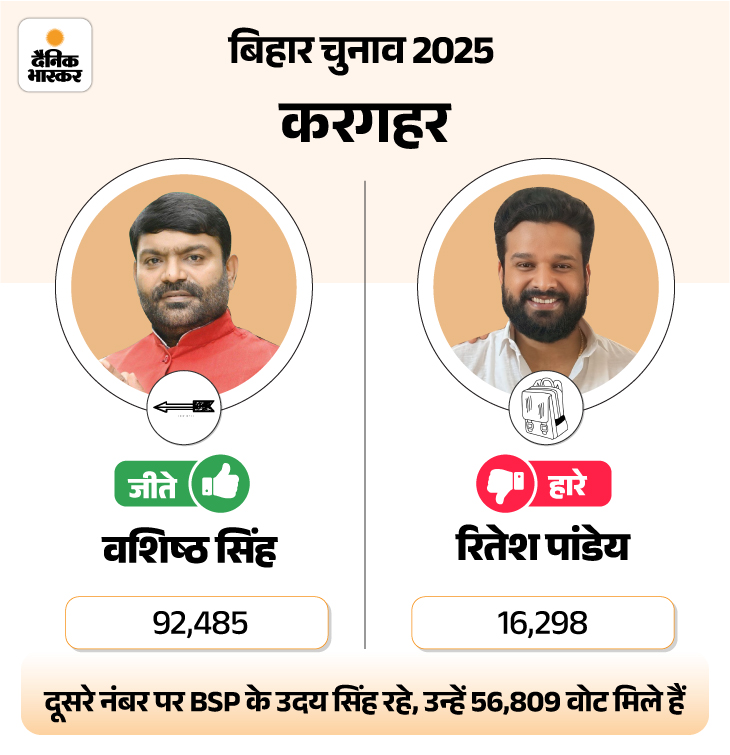 करगहर में भोजपुरी सिंगर रितेश पांडे चुनाव हार गए हैं। जन सुराज की टिकट पर लड़े रितेश को सिर्फ 16,298 वोट मिले। वे चौथे नंबर पर रहे। यहां से JDU के वशिष्ठ सिंह जीते हैं। बसपा के उदय प्रताप सिंह दूसरे नंबर पर हैं।