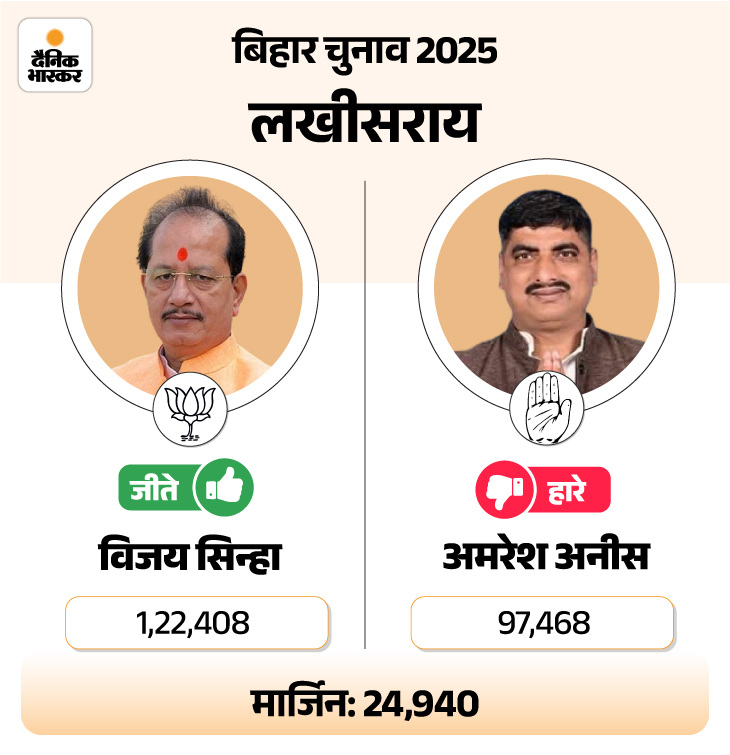 लखीसराय में डिप्टी CM विजय कुमार सिन्हा जीत गए हैं। उन्होंने कांग्रेस के अमरेश कुमार अनीस को 24,940 वोट से हराया।