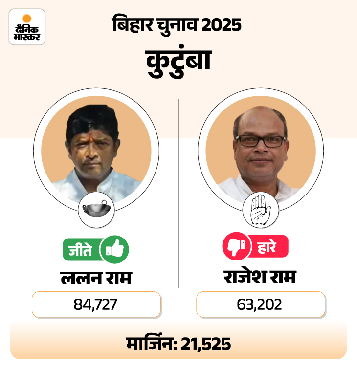 1. 2020 में ललन राम निर्दलीय चुनाव लड़े थे, उन्हें 20 हजार वोट मिले थे। NDA के श्रवण भुइया को 34 हजार वोट मिले थे। ललन राम इस बार NDA कैंडिडेट हैं। 2. कुटुंबा में राजपूत वोटर ज्यादा हैं, जिन्हें NDA का वोटर माना जाता है। 3. RJD के लोकल लीडर कुटुंबा सीट की मांग कर रहे थे। यादव पार्टी के कोर वोटर हैं, वे राजेश राम से नाराज थे।