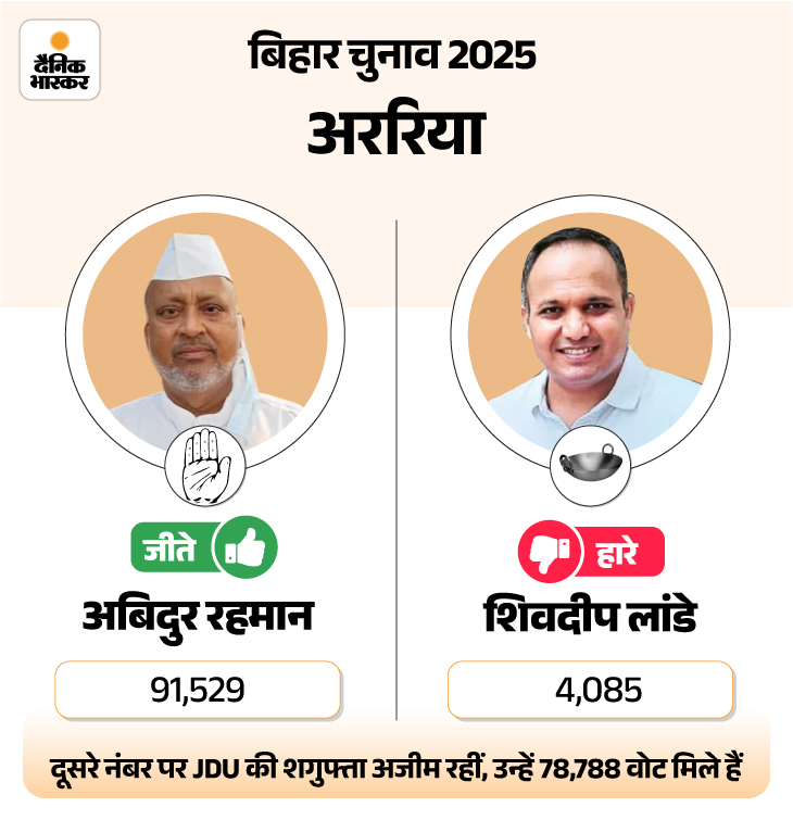 1. शिवदीप लांडे के मुकाबले कांग्रेस और JDU कैंडिडेट ज्यादा मजबूत थे। 2. कांग्रेस के अबिदुर रहमान दो बार से विधायक हैं। पिता मंत्री रहे, इसलिए उनका अपना वोट बैंक है। 3. अररिया में 32% मुस्लिम वोटर हैं। उनके बीच अबिदुर रहमान की अच्छी पैठ है।
