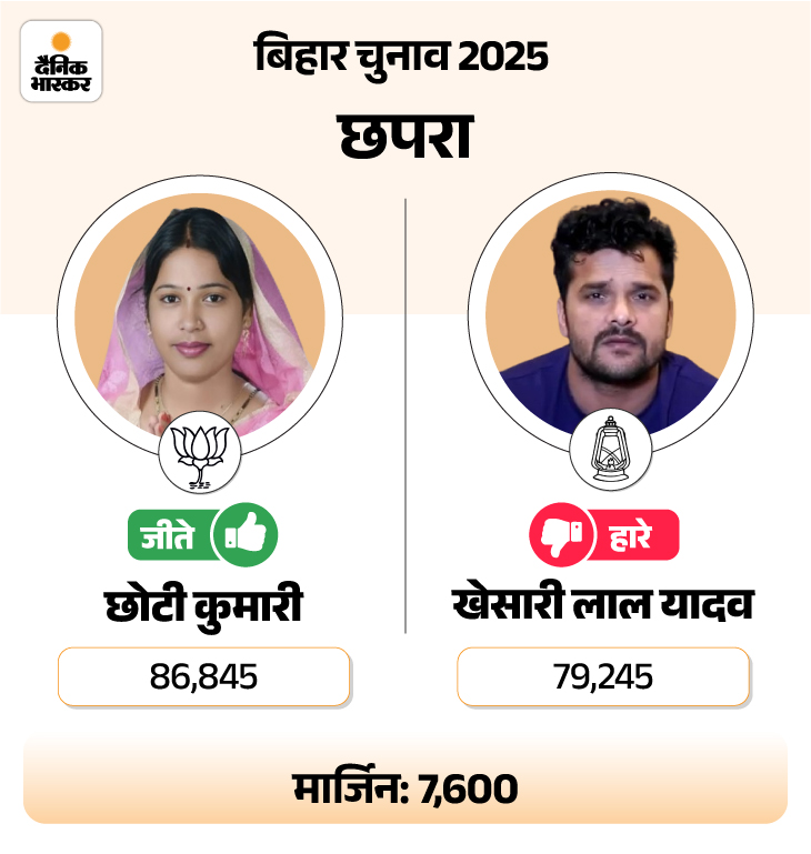 पिछड़ने की वजह 1. खेसारी पॉपुलर भोजपुरी सिंगर हैं, लेकिन इसका फायदा नहीं मिला। 2. BJP की बागी राखी गुप्ता, छोटी कुमारी के वोट काटतीं तो खेसारी को फायदा मिलता, लेकिन ऐसा नहीं हुआ। 3. छ्परा के लोग मौजूदा विधायक सीएन गुप्ता से नाराज थे। इलाके में टूटी सड़कें और जलभराव बड़ी समस्या थी।