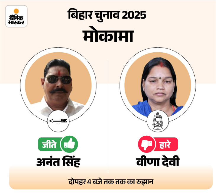 मोकामा में फिलहाल JDU के अनंत सिंह 28,206 वोट से जीत गए हैं। दूसरे नंबर पर RJD की वीणा सिंह रहीं। अनंत सिंह ने ये चुनाव जेल में रहते हुए जीता है। दुलारचंद मर्डर केस में वे जेल में हैं।
