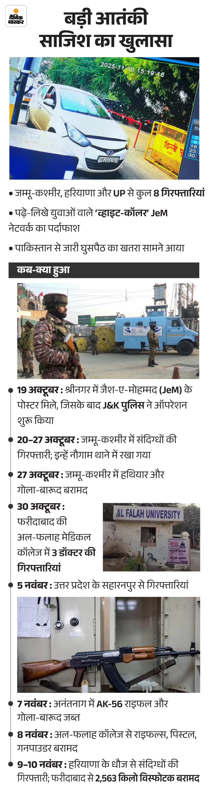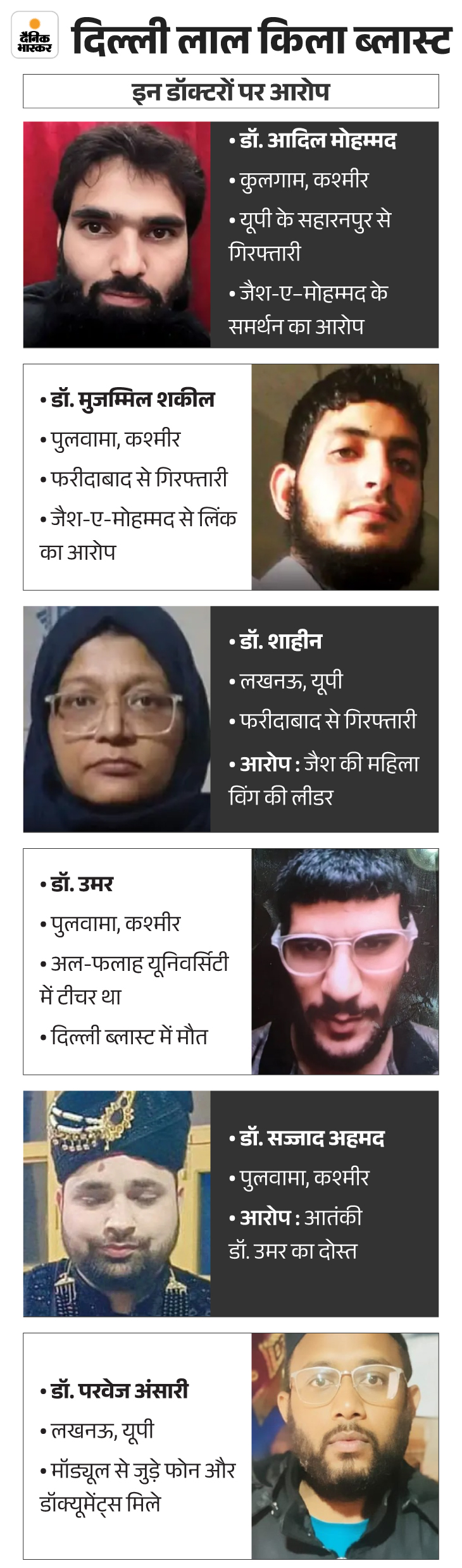 10 नवंबर 2025…दिल्ली में लाल किला के पास आतंकी डॉ उमर ने हमले की साजिश को अंजाम दिया। कार में हुए ब्लास्ट में 13 लोगों की मौत हुई, जबकि 20 लोग घायल हुए। इस हमले के कनेक्शन में अब तक डॉ. मुजम्मिल, डॉ. आदिल और डॉ. शाहीन समेत 8 लोग गिरफ्तार किए गए हैं।