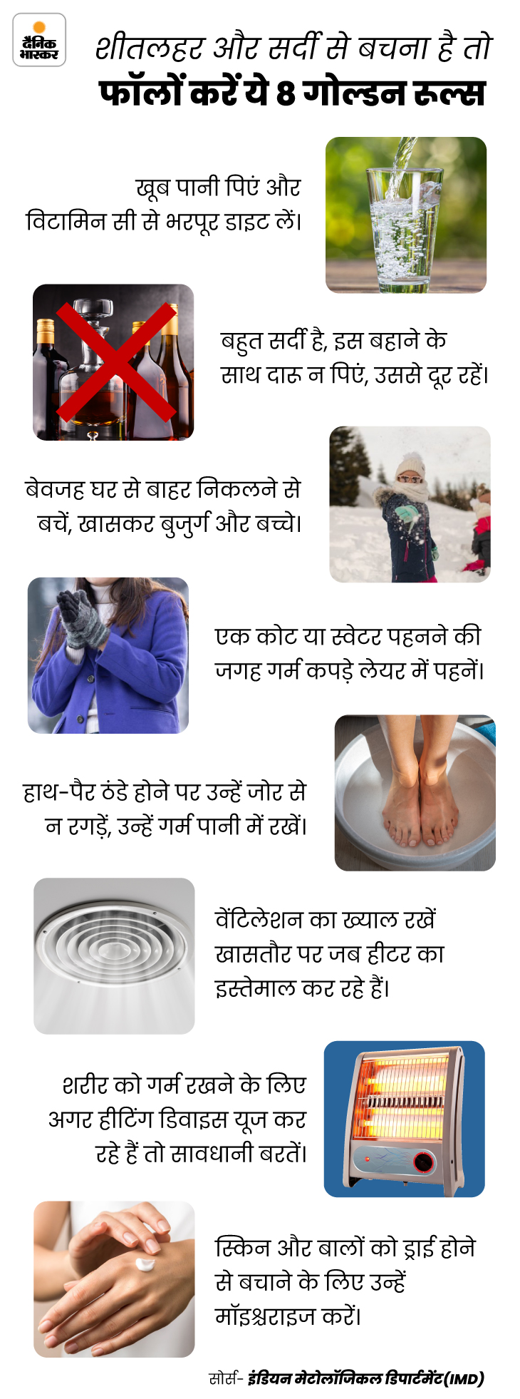 रविवार को राज्य के 12 जिलों में मध्यम से तेज शीतलहर की आशंका है। विभाग का कहना है कि न्यूनतम तापमान 6.2 डिग्री तक जा सकता है, जिससे सर्दी का असर और गहरा होगा। लोगों से खासकर सुबह के समय अतिरिक्त सतर्क रहने को कहा गया है, क्योंकि इसी दौरान तापमान सबसे तेजी से नीचे जाता है। ठंड से सेहत प्रभावित होने का खतरा रहता है।