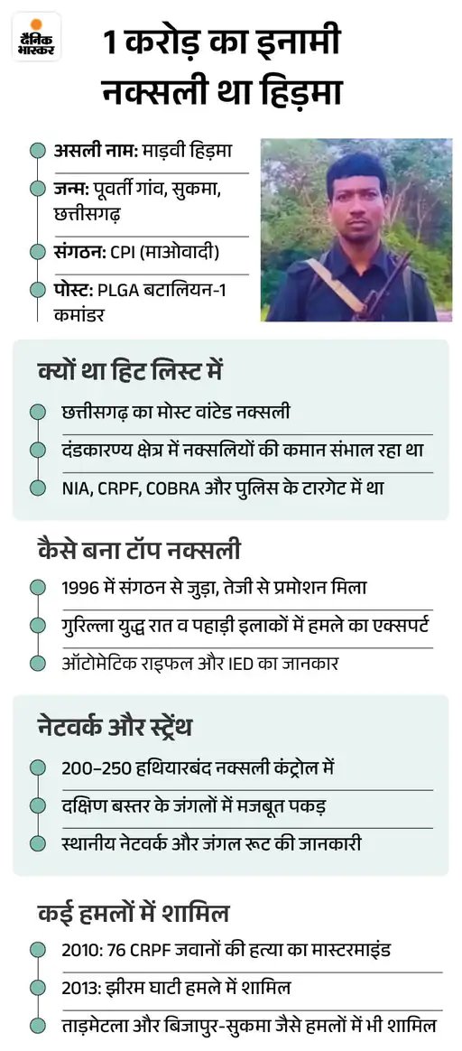 हिड़मा पिछले 2 दशक में हुए 26 से ज्यादा बड़े नक्सली हमलों का मास्टरमाइंड रहा है। इनमें 2010 दंतेवाड़ा हमला भी शामिल है, जिसमें 76 CRPF जवान शहीद हुए थे। इसके अलावा 2013 में झीरम घाटी हमले, 2021 सुकमा-बीजापुर हमले में भी हिड़मा की भूमिका रही है।