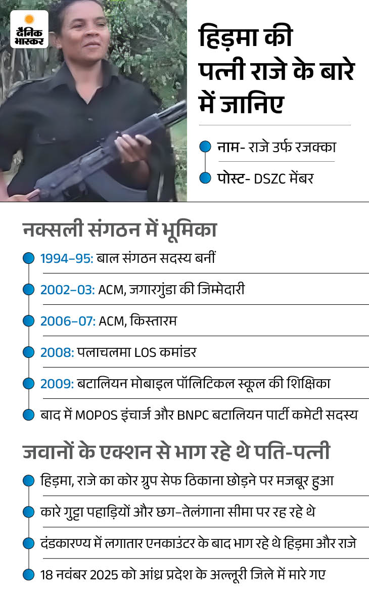 छत्तीसगढ़-आंध्र प्रदेश बॉर्डर पर मरेडमिल्ली जंगल में 18 नवंबर की सुबह मुठभेड़ में माड़वी हिड़मा मारा गया। हिड़मा देश के सबसे खतरनाक नक्सल कमांडरों में शामिल था। इसके साथ ही उसकी पत्नी राजे उर्फ रजक्का और 4 अन्य नक्सलियों भी इस एनकाउंटर में मारे गए।