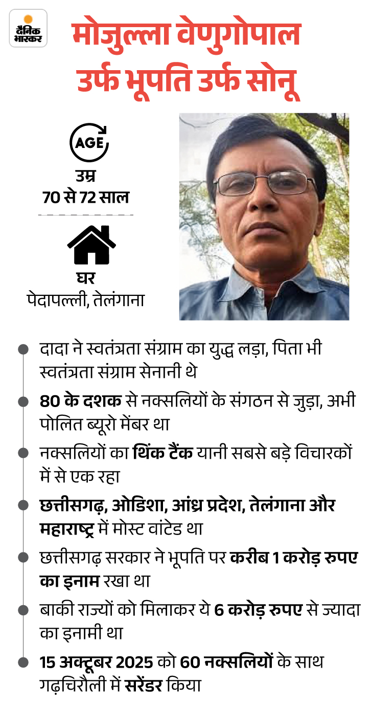 रूपेश के सरेंडर से दो दिन पहले 15 अक्टूबर को मोजुल्ला वेणुगोपाल उर्फ भूपति ने गढ़चिरौली में सरेंडर किया था। उस पर छत्तीसगढ़ सरकार ने 1 करोड़ का इनाम रखा था। दावा है कि रूपेश और भूपति कॉन्टैक्ट में थे और सरेंडर का फैसला दोनों ने मिलकर लिया था।