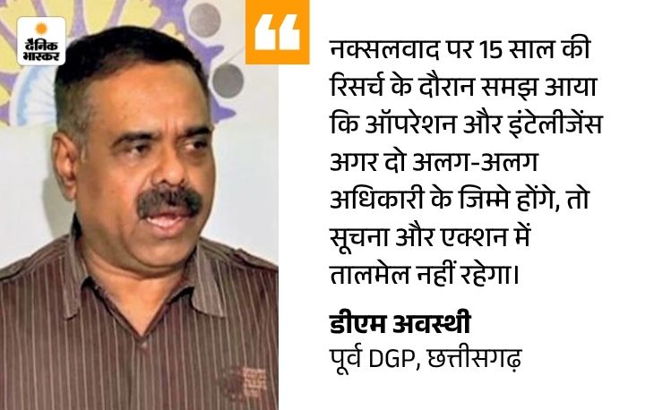 अब बात उन दो अफसरों की, जिन्होंने नक्सलियों के खात्मे की रणनीति बनाई अफसर: रिटायर्ड IPS डीएम अवस्थी क्या किया: नक्सलवाद के खात्मे में आ रही मुश्किलें दूर कीं डीएम अवस्थी 2015 के आखिर में DG नक्सल बने। वे बताते हैं, ‘2014 में देश में नई सरकार बनी थी। 2015 के नवंबर में एक मीटिंग हुई। उस वक्त राजनाथ सिंह गृह मंत्री थे। नक्सलवाद खत्म करने को लेकर मीटिंग में निर्देश मिले। कहा गया कि वे मुद्दे और लूपहोल्स तलाशने हैं, जो नक्सलवाद के खात्मे में रोड़ा बन रहे हैं। मुझे नक्सल DG बनाया गया और सुंदरराज को नक्सल DIG। हमने मिलकर टीम बनाई। इसमें CRPF के कुछ अधिकारी भी थे।’