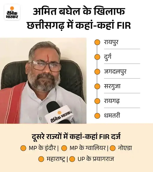 अमित बघेल के खिलाफ अग्रवाल और सिंधी समाज ने रायपुर के अलग-अलग थानों में FIR दर्ज कराई है। इसके अलावा छत्तीसगढ़ और देश के अलग-अलग थानों में FIR दर्ज है। इनमें बेंगलुरु, रायपुर, दुर्ग, धमतरी, इंदौर, ग्वालियर, नोएडा, महाराष्ट्र और प्रयागराज शामिल है।