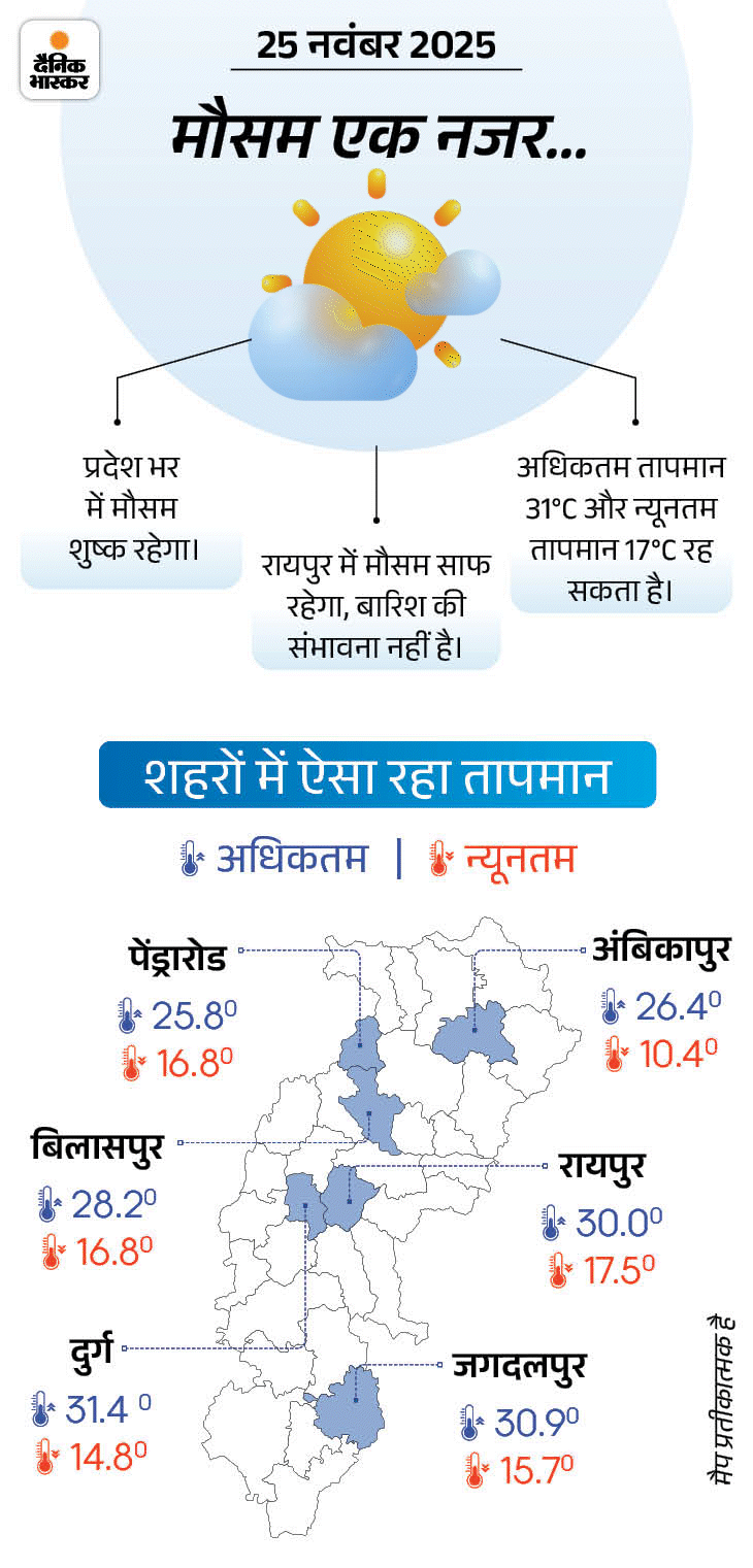 पिछले 24 घंटों में राज्य का सबसे अधिक अधिकतम तापमान 31.7°C दंतेवाड़ा में और सबसे कम न्यूनतम तापमान 10.4°C अंबिकापुर में दर्ज किया गया। पांच दिन पहले अंबिकापुर में तापमान 6°C तक गिर गया था, जो पिछले दस वर्षों में नवंबर महीने में पहली बार रिकॉर्ड हुआ।