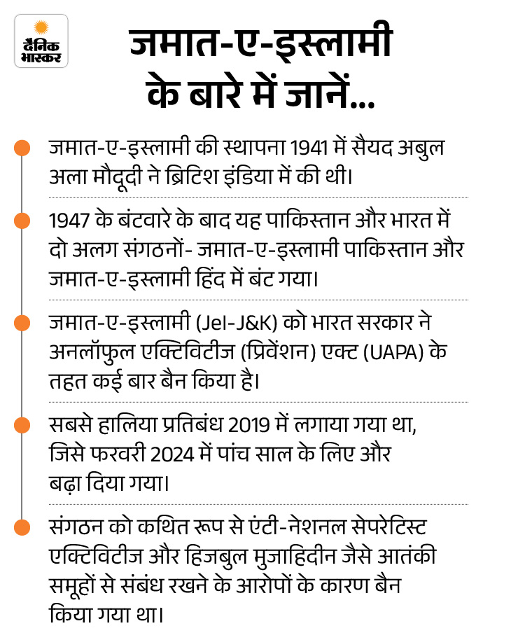 जम्मू-कश्मीर के 5 जिलों में शुक्रवार को पुलिस ने प्रतिबंधित आतंकी संगठन जमात-ए-इस्लामी (JeI) से जुड़े कई लोगों के ठिकानों पर रेड की। पुलिस ने तलाशी के दौरान कई डॉक्यूमेंट्स समेत मोबाइल, लैपटॉप जब्त किए हैं।