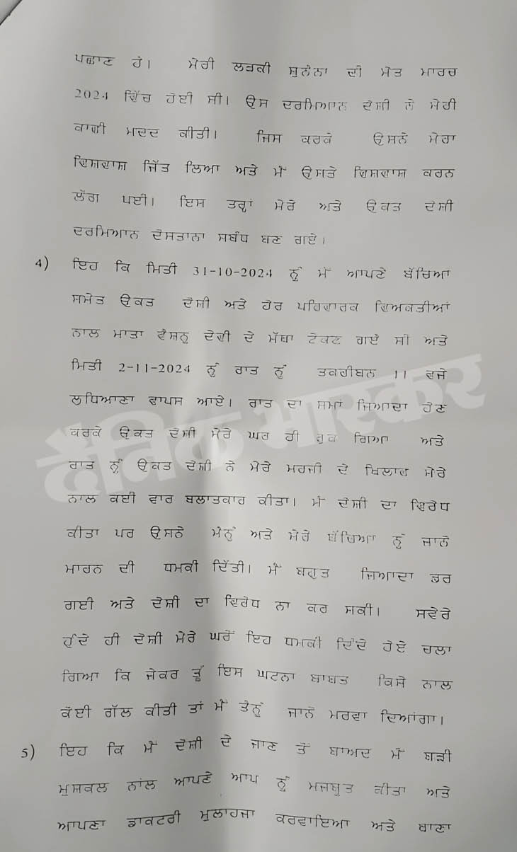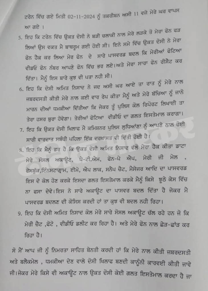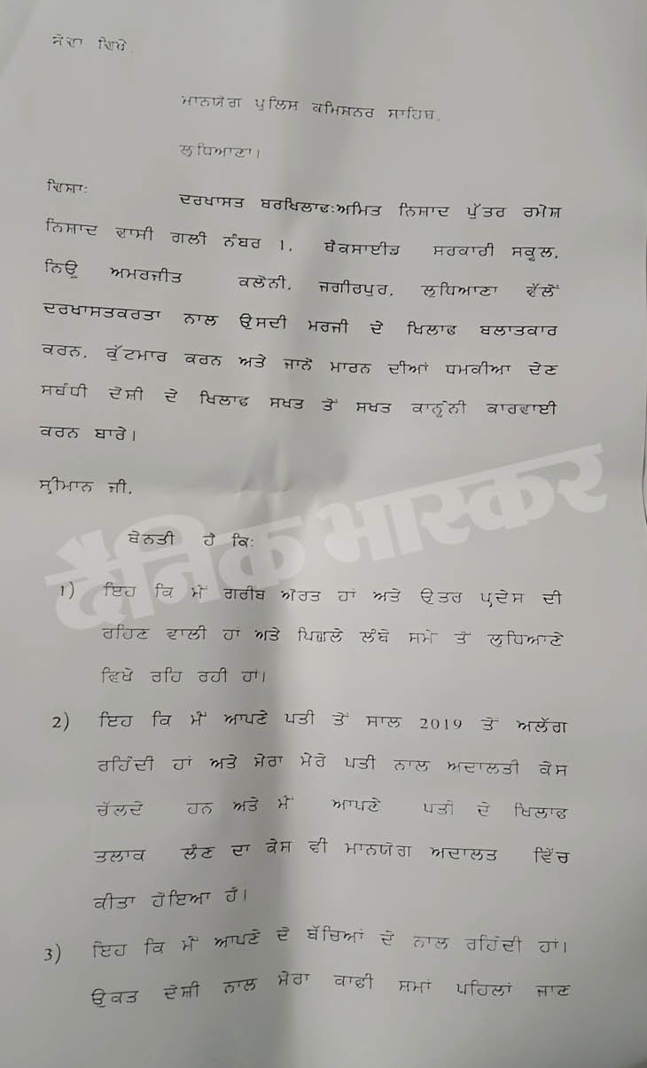 डेटा ट्रांसफर करने के बाद उसने मोबाइल रिसेट कर दिया। लुधियाना पहुंचने के बाद अमित निषाद उसके घर रुक गया और रात में उसने कई बार उसके साथ जबरन रेप किया। उसके बाद अमित निषाद ने उसे धमकी दी कि अगर उसने किसी को बताया तो वह उसे और उसके बच्चों को जान से मार देगा।