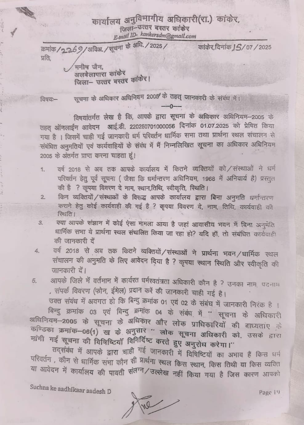 RTI से मिले दस्तावेज बताते हैं कि 2018 से जून 2025 तक कांकेर जिले में किसी ने भी धर्म परिवर्तन नहीं किया और ना ही इसके लिए कोई आवेदन दिया है। यहां गांवों में लोग चर्च के रजिस्टर नहीं दिखाते, कोई धर्म परिवर्तन का दस्तावेज नहीं है और सरकारी रिकॉर्ड में आज भी उनका वही धर्म दर्ज है जो जन्म से चला आ रहा है। फिर भी वे यीशु को मानते हैं।