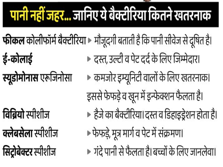 सूत्रों के मुताबिक पानी में हैजा फैलाने वाला विब्रियो कोलेरी भी मिला है, लेकिन सरकारी तंत्र इसे अब भी प्रारंभिक रिपोर्ट कहकर टाल रहा है। रिपोर्ट ने साफ कर दिया है कि पानी में जिस तरह के बैक्टीरिया मिले है, इसका मतलब साफ है कि पानी में सीपेज मिल रहा था।