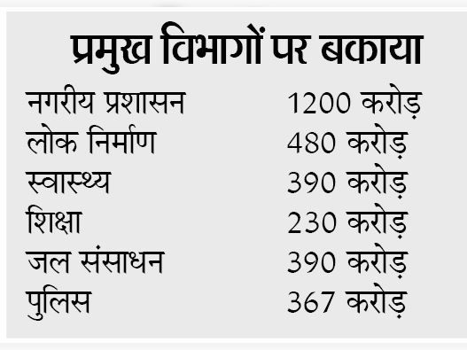 नतीजा इन विभागों पर बिजली कंपनी का बकाया 3000 करोड़ रुपए से अधिक पहुंच चुका है। प्रदेश में 59 लाख से ज्यादा बिजली उपभोक्ता हैं। इनमें से 44 लाख घरेलू (एलटी) और शेष एचटी व सरकारी विभाग शामिल हैं। लगभग ढाई से तीन लाख कनेक्शन सरकारी विभागों के हैं, जिन पर ही अधिकांश बकाया जमा है।