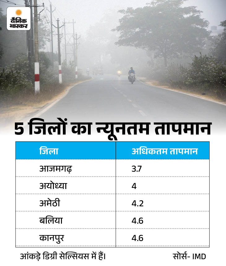 पिछले 24 घंटे की बात करें तो आजमगढ़ सबसे ठंडा रहा। यहां का पारा 3.7 डिग्री रिकॉर्ड किया गया।