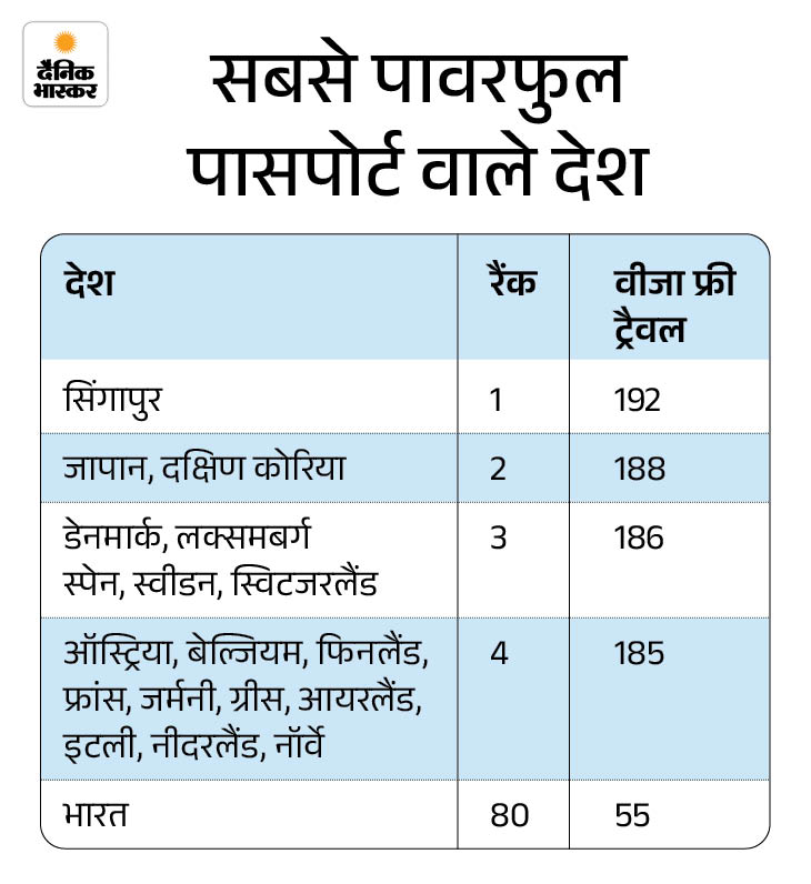 रैंकिंग इस आधार पर तय की जाती है कि किसी देश का पासपोर्ट होल्डर कितने दूसरे देशों में बिना पूर्व वीजा हासिल किए यात्रा कर सकता है। इसके लिए उसे पहले से वीजा लेने की जरूरत नहीं होगी।