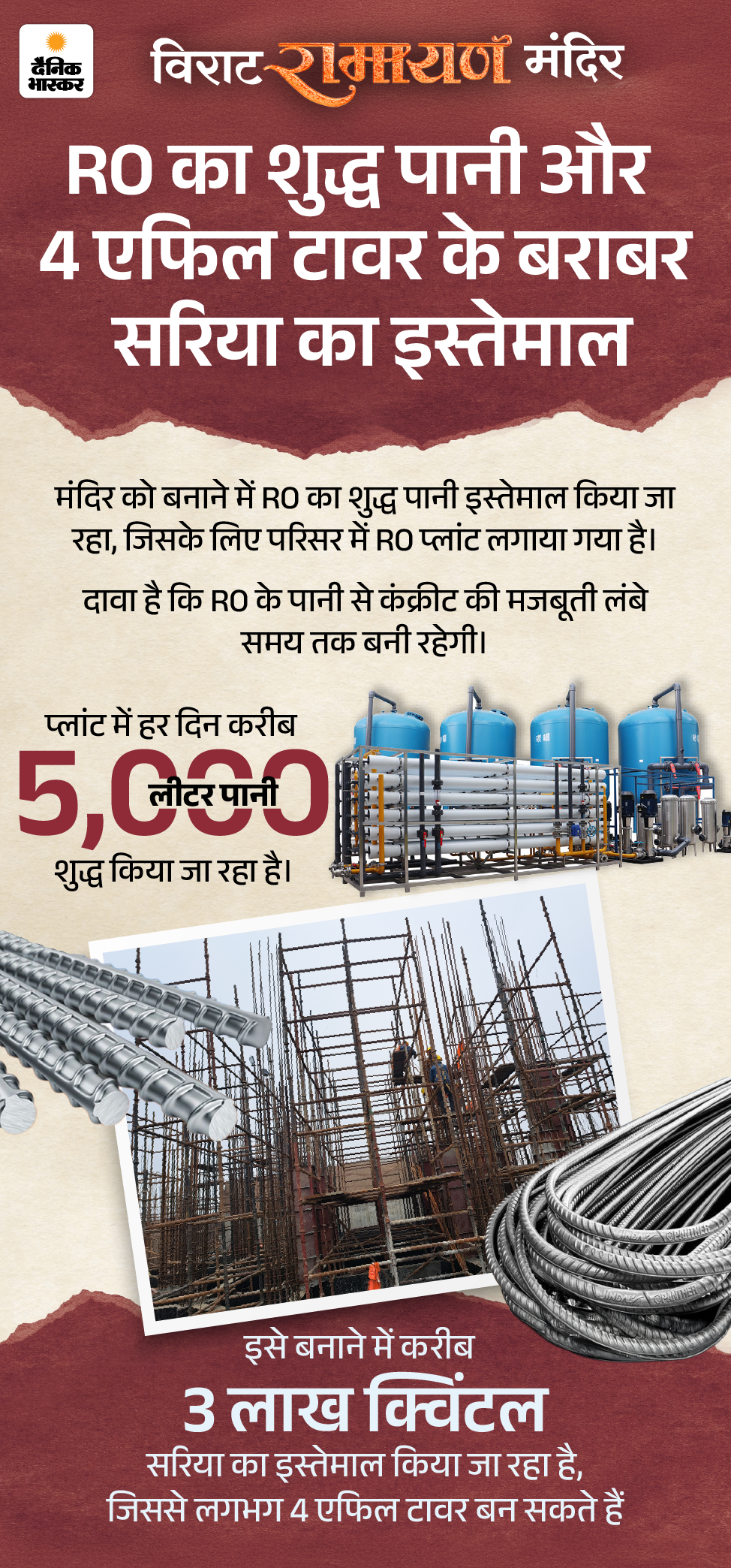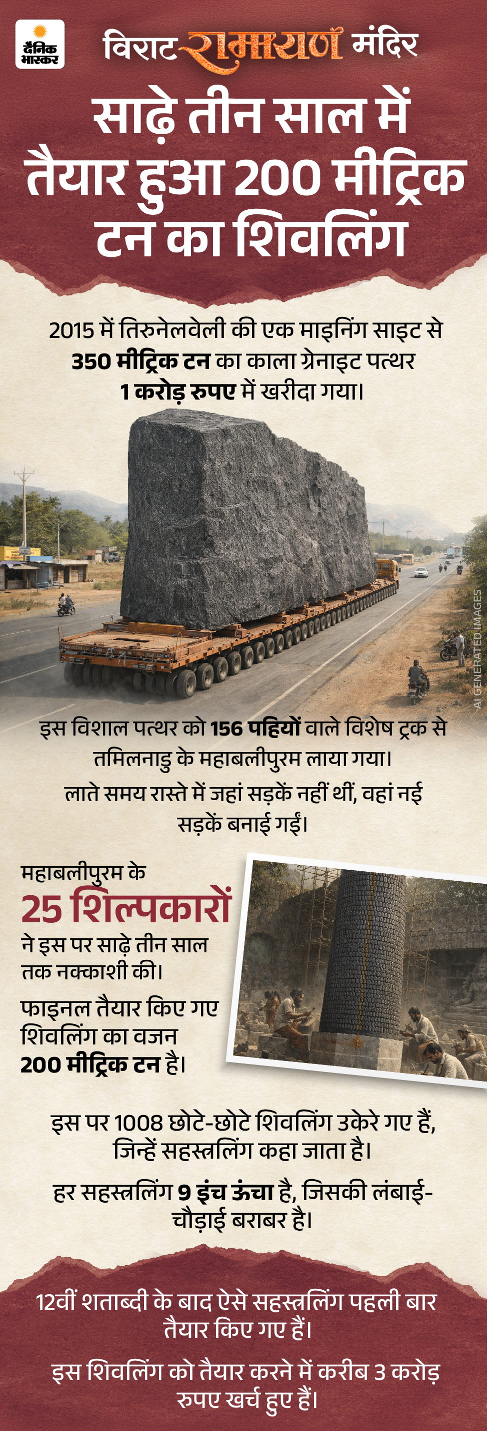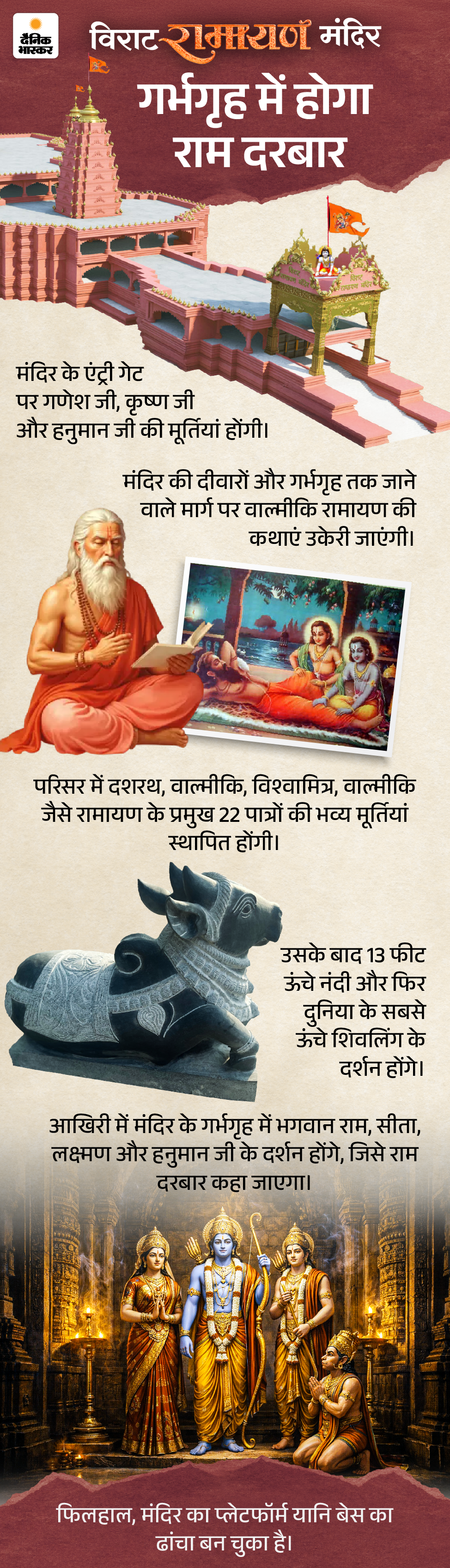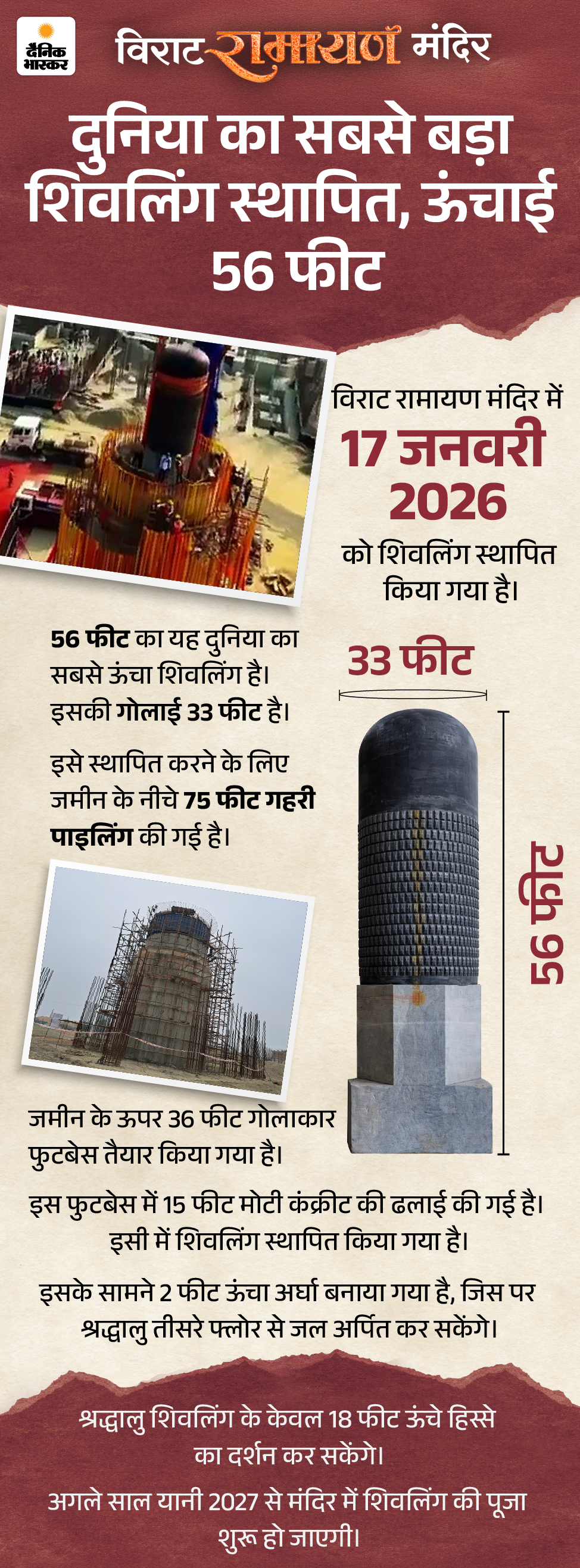 इस मंदिर को पटना का महावीर मंदिर न्यास बोर्ड बनवा रहा है। बोर्ड के सुपरिंटेंडेंट सायन कुणाल बताते हैं कि 17 जनवरी 2026 को स्थापित शिवलिंग की पूजा साल 2027 से शुरू होगी। मंदिर में वाल्मीकि, विश्वामित्र, दशरथ जैसे रामायण के 22 प्रमुख पात्रों की भव्य मूर्तियां भी लगेंगी। इसे बनाने के लिए RO का पानी, करीब 3 लाख क्विंटल सरिया और राजस्थान के लाल पत्थर का इस्तेमाल हो रहा है।