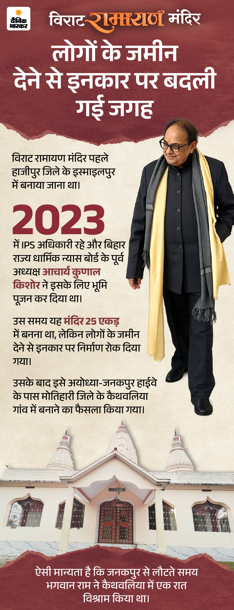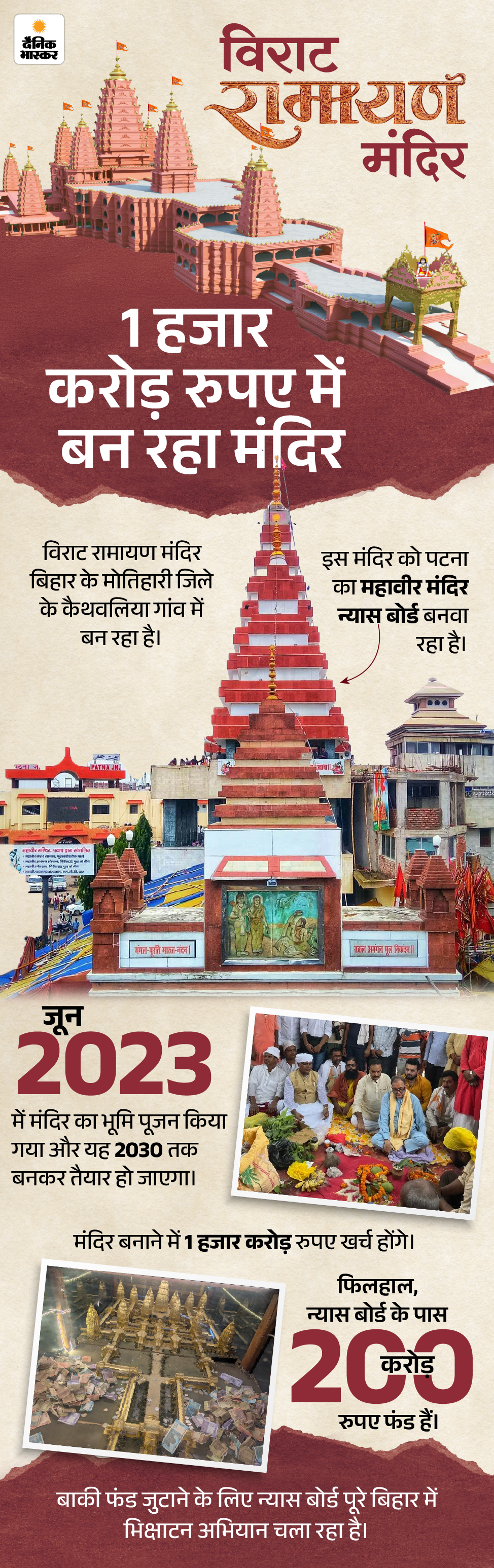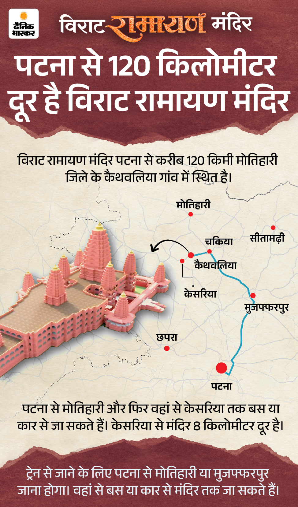 दैनिक भास्कर रिपोर्टर नीरज झा मंदिर की भव्यता को रिपोर्ट करने कैथवलिया गांव पहुंचे। प्रोजेक्ट अधिकारियों से बातचीत के आधार पर नीरज बताते हैं कि विराट रामायण मंदिर 270 फीट ऊंचा होगा, जबकि अयोध्या का राम मंदिर 161 फीट ऊंचा है। वहीं, विराट रामायण मंदिर का परिसर 120 एकड़ है, जबकि अयोध्या का राम मंदिर 70 एकड़ में फैला है।