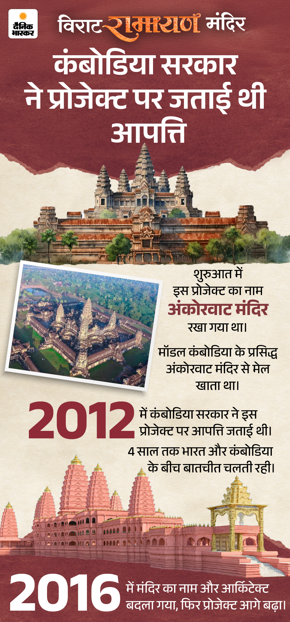 मंदिर को डिजाइन करने वाले आर्किटेक्ट नवरत्न रघुवंशी बताते हैं, ‘विराट रामायण मंदिर का मॉडल तीन बार बदला गया। आखिरकार मंदिर का मॉडल बनाने में 5 साल लगे, जिसे मिनिस्ट्री ऑफ कल्चर को भेजकर फाइनल किया गया।’