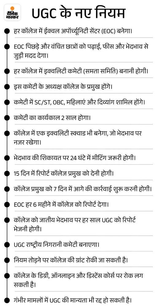 विजेंद्र सिंह बोले- जातिगत वर्गीकरण में मत बांटिए भिवानी के रहने वाले ओलिंपियन बॉक्सर विजेंदर सिंह ने अपनी X पोस्ट में लिखा – “शिक्षा समान अवसर का माध्यम है, जातिगत विभाजन का नहीं। UGC का छात्रों को वर्गों में बांटने वाला यह निर्णय देश के भविष्य के लिए चिंताजनक है। कक्षा में बैठा युवा ही देश का भविष्य है, कृपया इसे जातिगत वर्गीकरण में मत बांटिए। शिक्षा का मूल उद्देश्य अवसर प्रदान करना है। UGC को फैसले पर पुनर्विचार कर इसे वापस लेना चाहिए।”