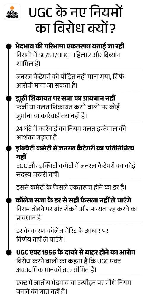 बीजेपी महिला नेता मनीषा शर्मा ने दिया इस्तीफा भाजपा की कार्यकर्ता मनीषा शर्मा ने यूजीसी एक्ट-2026 के विरोध में पार्टी के सभी पदों और प्राथमिक सदस्यता से इस्तीफा दे दिया है। मनीषा हरियाणा में झज्जर के खरहर गांव की रहने वाली हैं। उन्होंने कहा कि इस नए यूजीसी एक्ट से शैक्षणिक असमानता बढ़ेगी और संविधान के अनुच्छेद 14 (समान नागरिकता का अधिकार) का उल्लंघन होगा, इसलिए उन्होंने संविधान और शिक्षा के हित में यह निर्णय लिया है। उनका यह कदम निजी कारणों से नहीं, बल्कि नीति और सिद्धांतों पर आधारित विरोध के रूप में है।