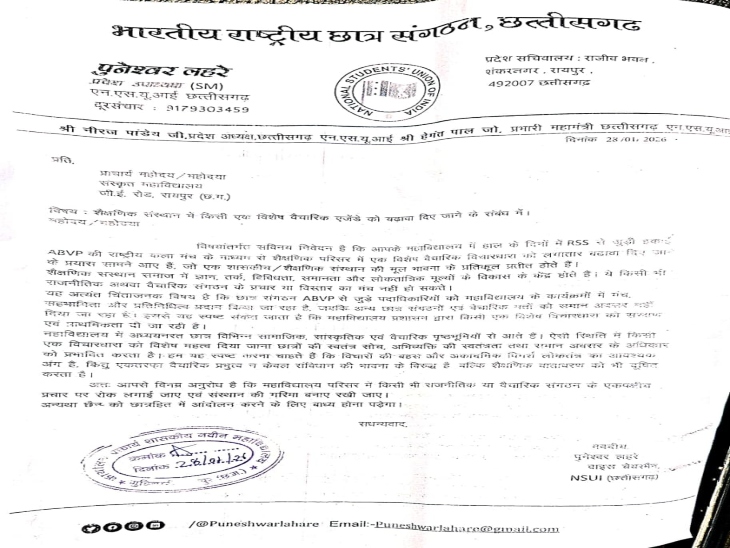 NSUI के वाइस चेयरमैन एवं छात्र नेता पुनेश्वर लहरे के नेतृत्व में सौंपे गए ज्ञापन में कहा गया कि राजधानी रायपुर के कई कॉलेजों और विश्वविद्यालयों में लगातार ABVP से जुड़े पदाधिकारियों को कार्यक्रमों में प्राथमिकता दी जा रही है, जबकि अन्य छात्र संगठनों और अलग विचार रखने वाले छात्रों को समान अवसर नहीं मिल पा रहा। इससे शैक्षणिक परिसरों में एकतरफ़ा वैचारिक प्रभाव का संदेश जा रहा है।
