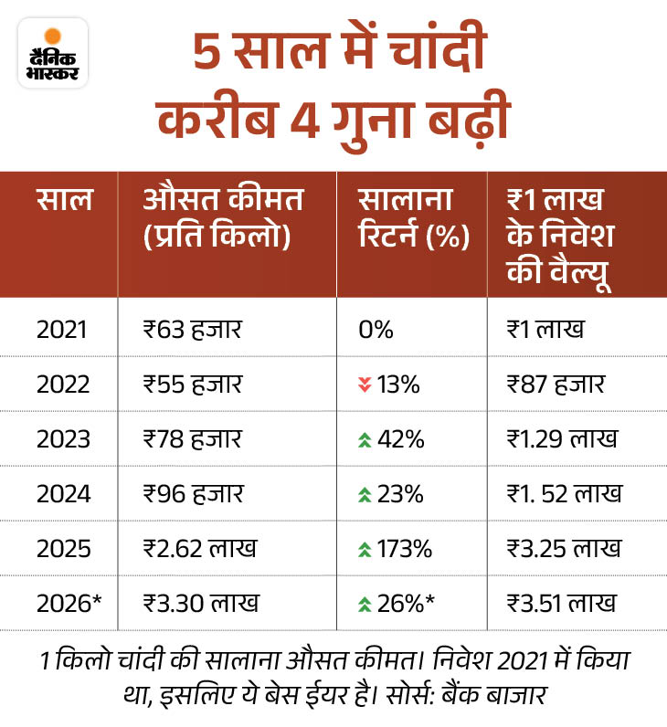 2025 में सोना 75% और चांदी 167% बढ़ी है। अभी यानी जनवरी 2026 में 10 ग्राम 24 कैरेट सोना 1.50 लाख और एक किलो चांदी 3.50 लाख रुपए में मिल रही है।