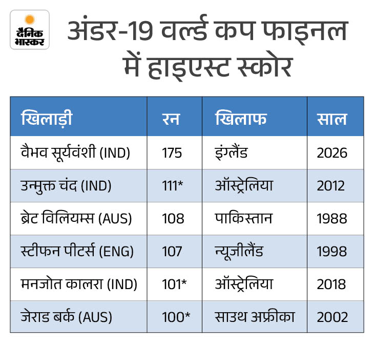 वैभव अंडर-19 वर्ल्ड कप फाइनल में सबसे ज्यादा रन बनाने वाले बल्लेबाज बन गए हैं। वैभव ने इंग्लैंड के खिलाफ 175 रन की पारी खेली। इससे पहले यह रिकॉर्ड भारत के ही उन्मुक्त चंद के नाम था, जिन्होंने 2012 में ऑस्ट्रेलिया के खिलाफ नाबाद 111 रन बनाए थे। तीसरे नंबर पर ऑस्ट्रेलिया के ब्रेट विलियम्स हैं। उन्होंने 1988 में पाकिस्तान के खिलाफ 108 रन बनाए थे।