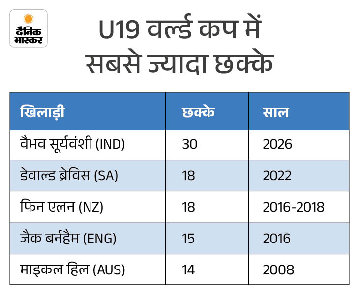 अंडर-19 वर्ल्ड कप में सबसे ज्यादा छक्के लगाने का रिकॉर्ड अब वैभव सूर्यवंशी के नाम दर्ज हो गया है। वैभव ने इस वर्ल्ड कप में 30 छक्के जड़े हैं। इससे पहले यह रिकॉर्ड डेवाल्ड ब्रेविस के नाम था, जिन्होंने 2022 अंडर-19 वर्ल्ड कप में 18 छक्के लगाए थे।